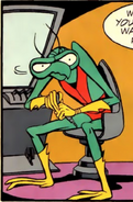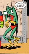 Zorak is a green mantis with a beak. He is hunched over. Zorak usually wears a blue or vermillion vest with a speedo. His wings are either black or blue. He wears yellow or blue gloves and boots. Zorak sometimes wears blue gloves and socks.